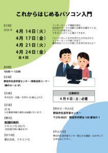 | 講座名 | 【はじめてのパソコン講座】これからはじめるパソコン入門(募集中) |