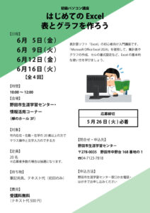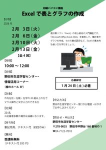 | 講座名 | 【初級パソコン講座】Excelで表とグラフの作成(募集中) |