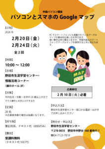 | 講座名 | 【中級パソコン講座】パソコンとスマホ併用のグーグルマップ(募集中) |